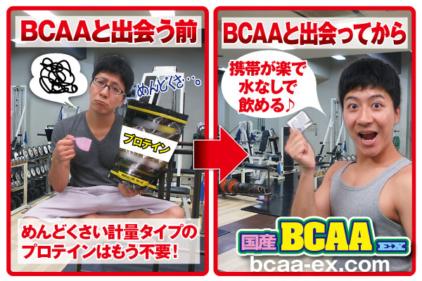 便利な分包タイプの【国産BCAA EX】(http://www.bcaa-ex.com)を、