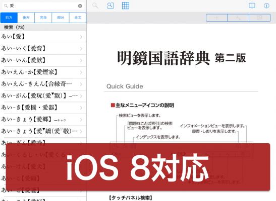 LogoVista電子辞典で培った検索方法を継承。前方一致/後方一致/完全一致/部分一致/全文検索といった豊富な検索オプションを利用できます。また文字を入力すると候補見出し語が表示され、うろ覚えでも検索できるインクリメンタルサーチや、検索結果に表示された本文中の用語をなぞることでそのまま連続辞書引きも可能。思考を妨げることなく次々と検索できるのが特長です。マルチタッチによる拡大やセンサーによる画面の回転にも対応しています。