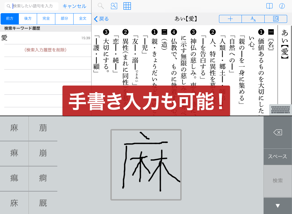 ●文字を入力すると候補見出し語が表示されるので、うろ覚えでも見つけやすい