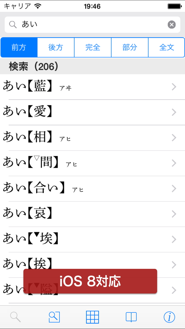 ●豊富な検索オプションを用意(前方一致検索・後方一致検索・完全一致検索・部分一致検索・全文検索)。それぞれの検索方法で、文字を入力すると候補見出し語が表示されるインクリメンタルサーチに対応。(部分一致、全文検索を除く)用語をうろ覚えでも検索が容易です。