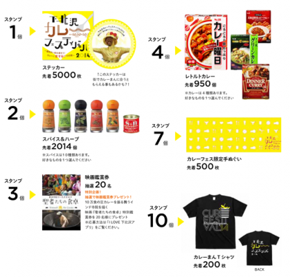 「I LOVE 下北沢アプリ」の初稼働イベントは、「下北沢カレーフェスティバル2014」のスタンプラリーです。カレーフェス参加店舗(スタンプ場所)でカレーを食べると「I LOVE 下北沢アプリ」にスタンプが貯まり、集めたスタンプ数に応じて、カレーフェスティバルオリジナルグッズやカレー関連グッズをプレゼントします。