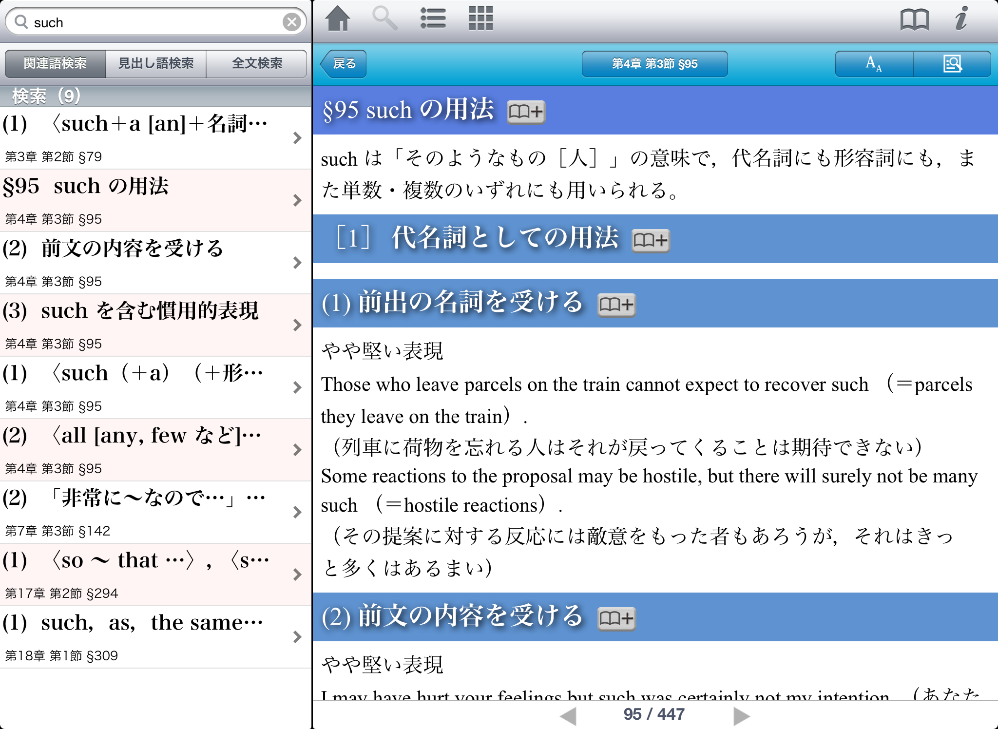 ・検索の種類を「関連語」「見出し語」「全文」へわかりやすく整理。