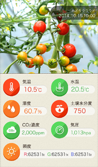 「みどりクラウド」は、センサーを搭載した「みどりボックス」、データを蓄積する「みどりクラウド」、データを確認するアプリ「みどりモニター」で構成さ れています。「みどりボックス」は、温度、湿度、CO2濃度、照度、写真を定期的に「みどりクラウド」に送信を行い、そのデータを「みどりモニター」をつ かってPCやスマートフォンから確認することができます。今後の機能追加により、アラート機能や施設内の環境予測サービスを提供する予定です。