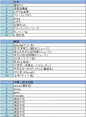 ・アジア11カ国の検索キーワードトレンド2014年9月29日~2014年10月5日 2014年10月6日リリース