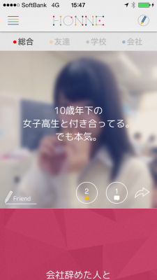 今回、この『HONNE』に新機能を追加したことで、同じ学校・同じ会社の人の本音が見られるようになりました。