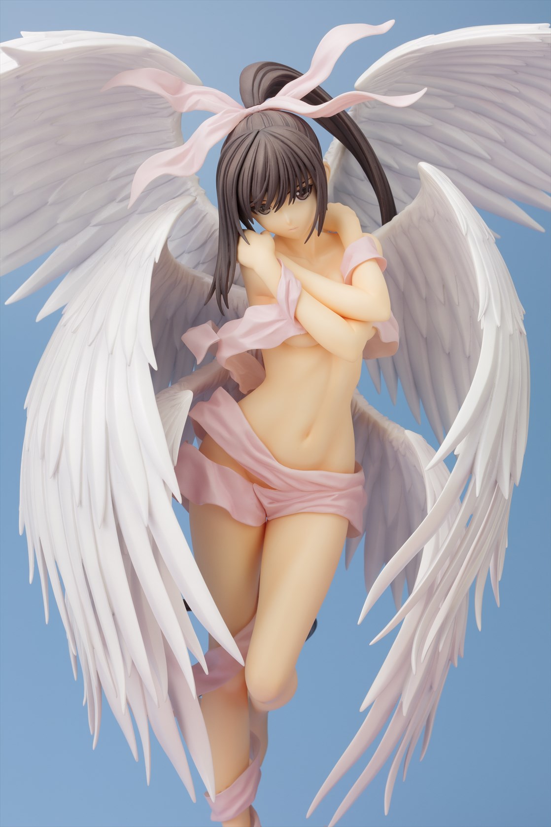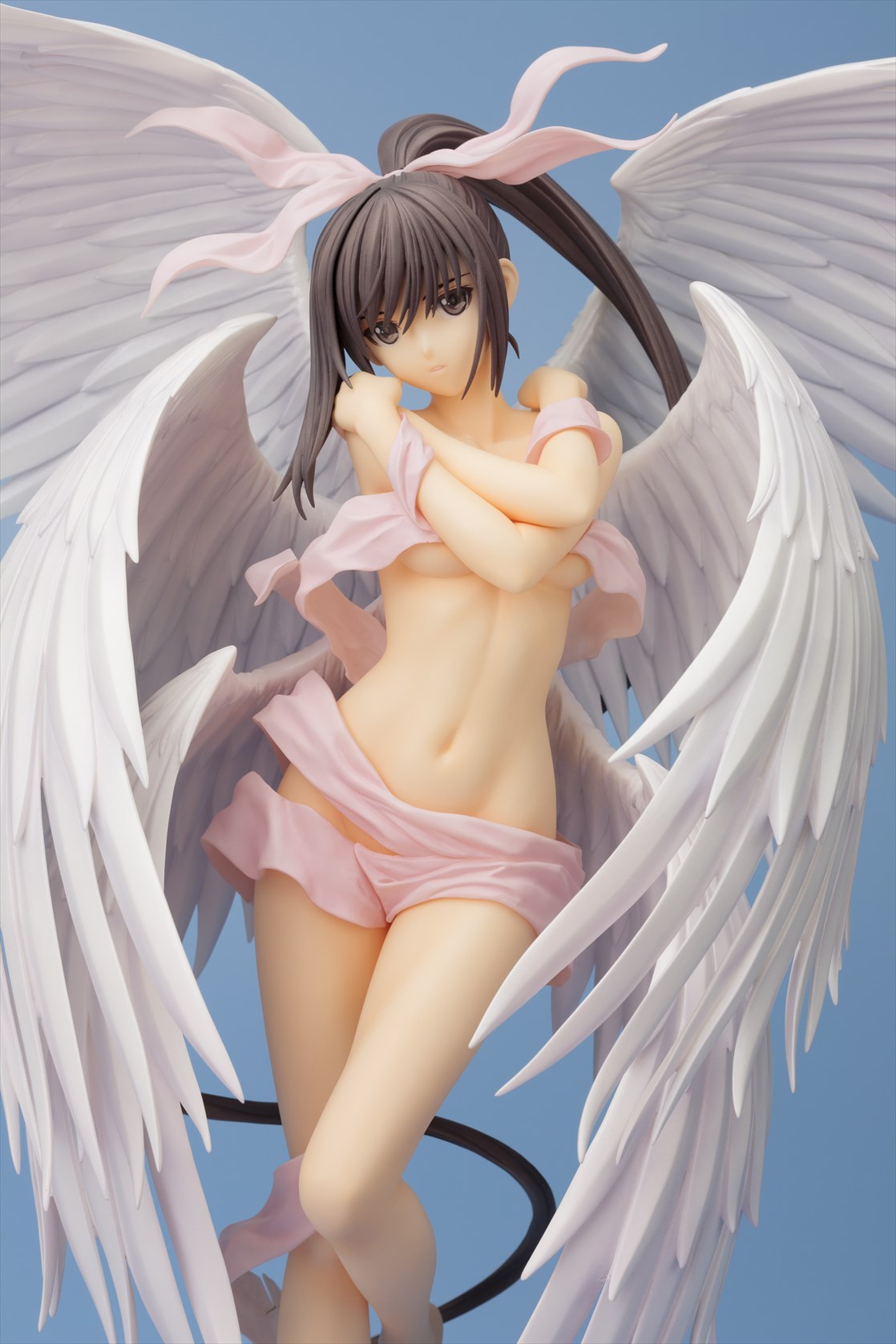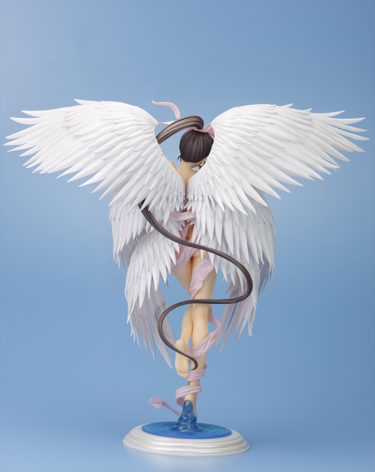 Tony氏の描く美麗なイラストを基に松本江永氏が渾身の立体化。全高約350mm、大きく広げた翼の全幅は約380mmにも及ぶ迫力サイズながら、布と翼からのぞく肢体もしなやかに美しく造形されています。全身を取り巻く薄布はクリア素材にフロスト塗装を施すことにより光を透過させ、軽やかな質感を表現、大きく羽ばたいた1対と身体を包み込む2対の巨大な6枚の翼は、パールコートにより柔らかな光沢を放つ羽根の質感を再現しました。フィギュア本体を引き立てるベースは水面をイメージしました。まさに女神降臨というべき神々しい姿、「サクヤ」の究極形ともいうべき造形をご堪能ください。