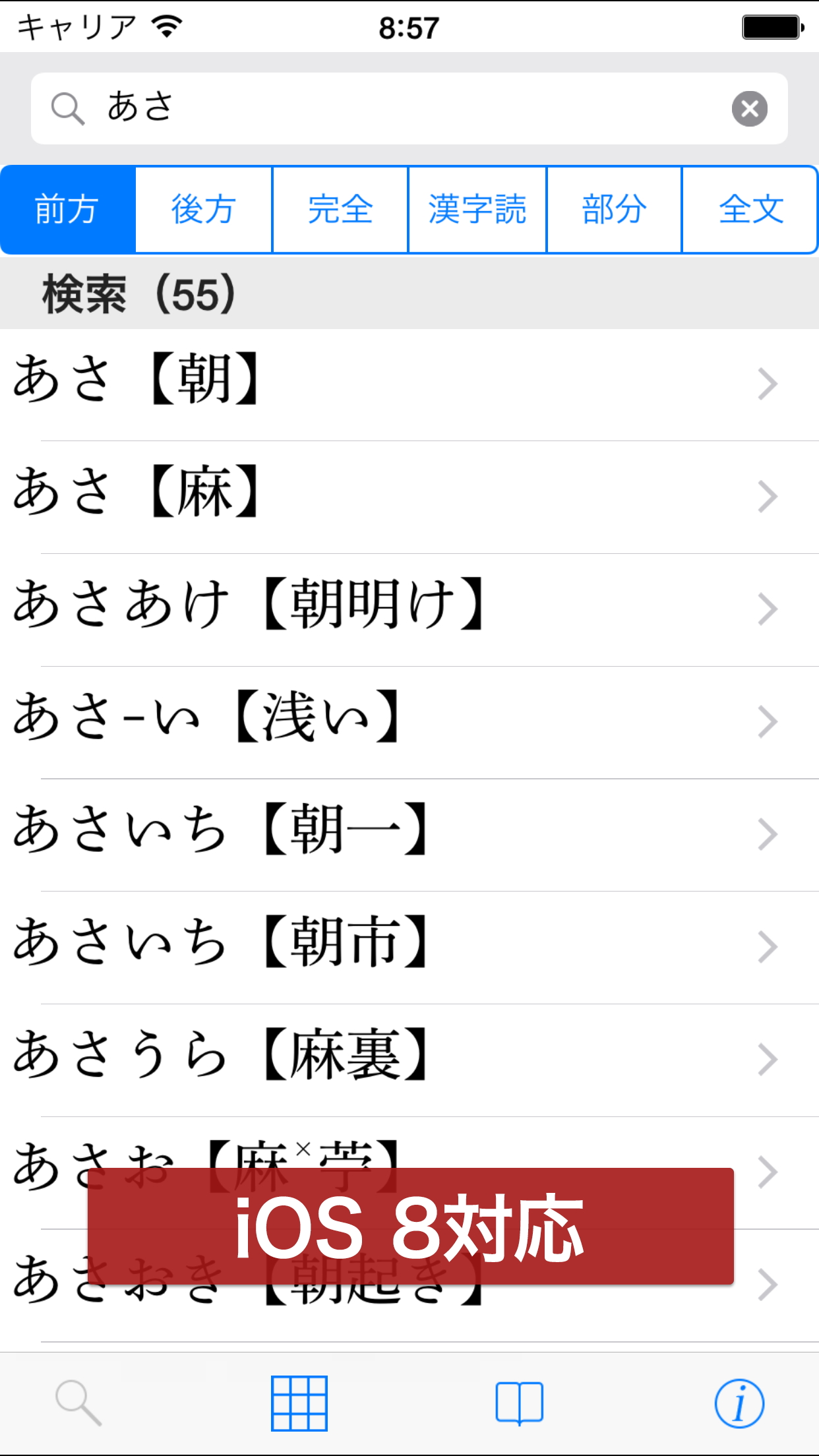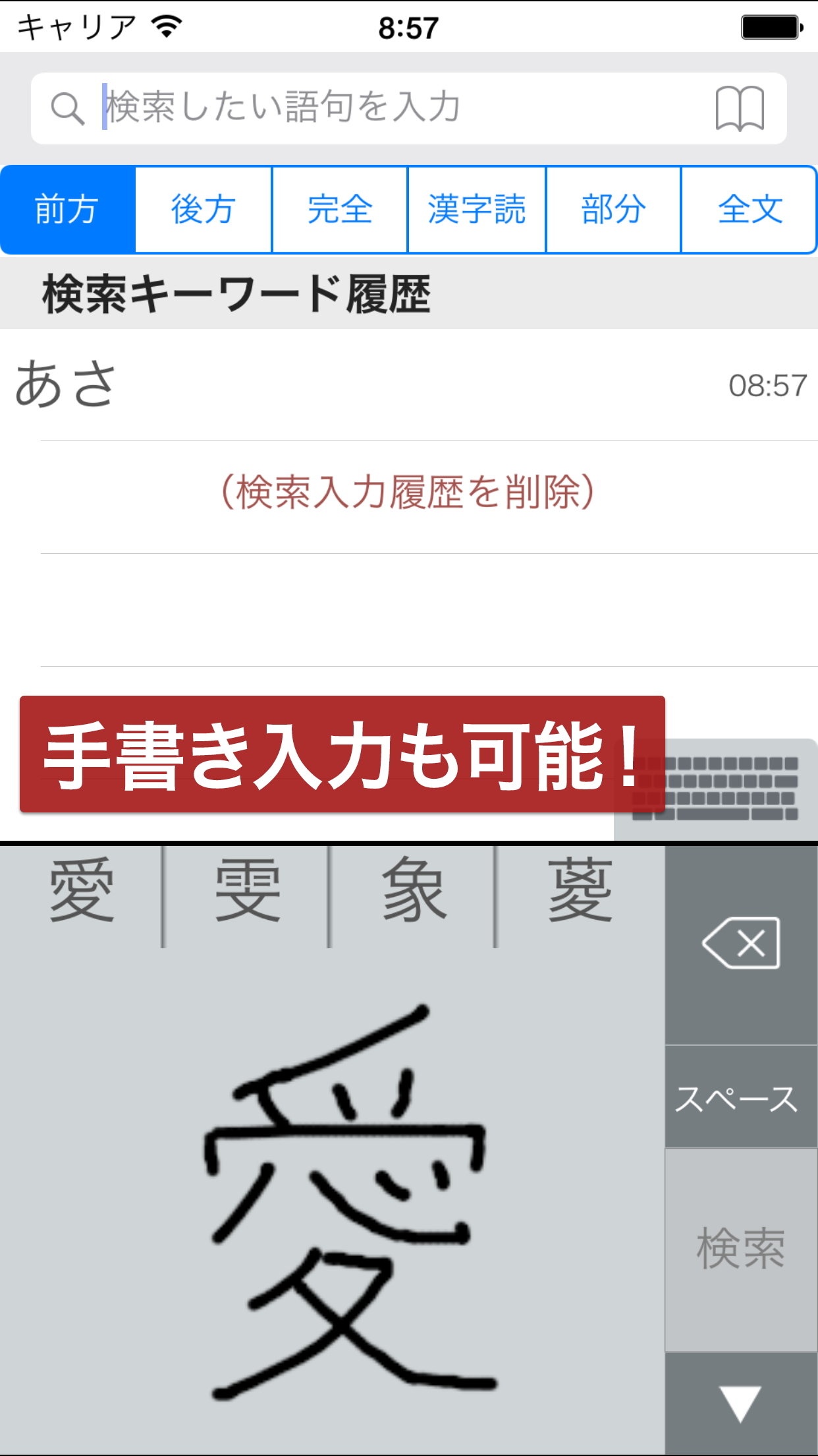 ●豊富な検索オプションを用意(前方一致検索・後方一致検索・完全一致検索・漢字読検索・部分一致・全文検索)。それぞれの検索方法で、文字を入力すると候補見出し語が表示されるインクリメンタルサーチに対応。(部分一致、全文検索を除く)用語をうろ覚えでも検索が容易です。