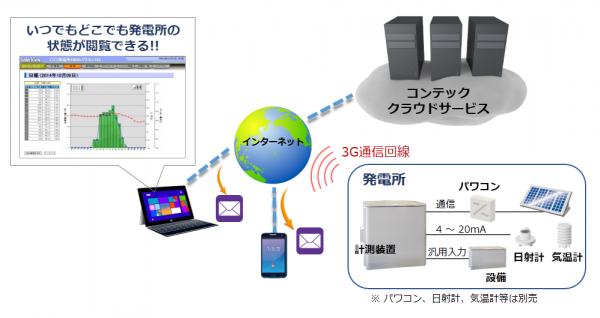 計測装置は最大9台のパワーコンディショナーとの接続・監視ができ、最大20拠点の発電所データを一括監視できます。発電所でトラブルが発生した場合には、警報メールを発信し異常の発生をお客様に通知します。