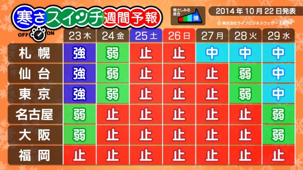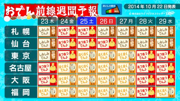 生活密着型天気予報を配信する株式会社ライフビジネスウェザー(本社:東京都中央区、代表取締役:石川勝敏 以下、LBW)は、2014年10月22日、特設サイトにて寒さの到来をいち早く伝える「寒さスイッチ予報」及び、寒さと関係のあるおでんのおいしい度合を伝える「おでん前線」予報の第6回発表を行いました。