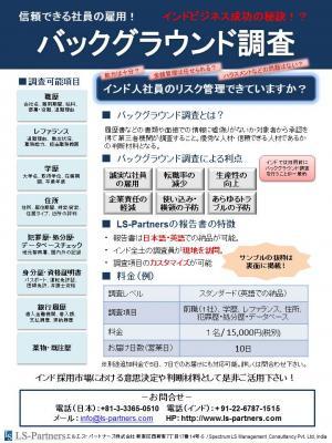 一方インドに子会社を構え独自ルート持つエルエス・パートナーズのバックグラウンド調査は、多岐にわたる調査項目を掲げた上で、さらにインド全土の調査員が実際に現地を訪問し、インタビューを実行。あらゆる角度から情報の真偽を分析する。また前職企業からの情報や、教育機関発行の在籍証明なども入手し、採用にあたり非常に現実的で実用性の高い報告書を提供している。本報告書は日本語・英語での納品、また調査項目のカスタマイズも可能。
