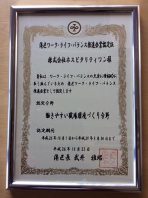 オーダーメイド型訪問看護サービスを提供しております株式会社ホスピタリティ・ワンは平成26年10月1日 ワーク・ライフ・バランス推進企業に認定されました。