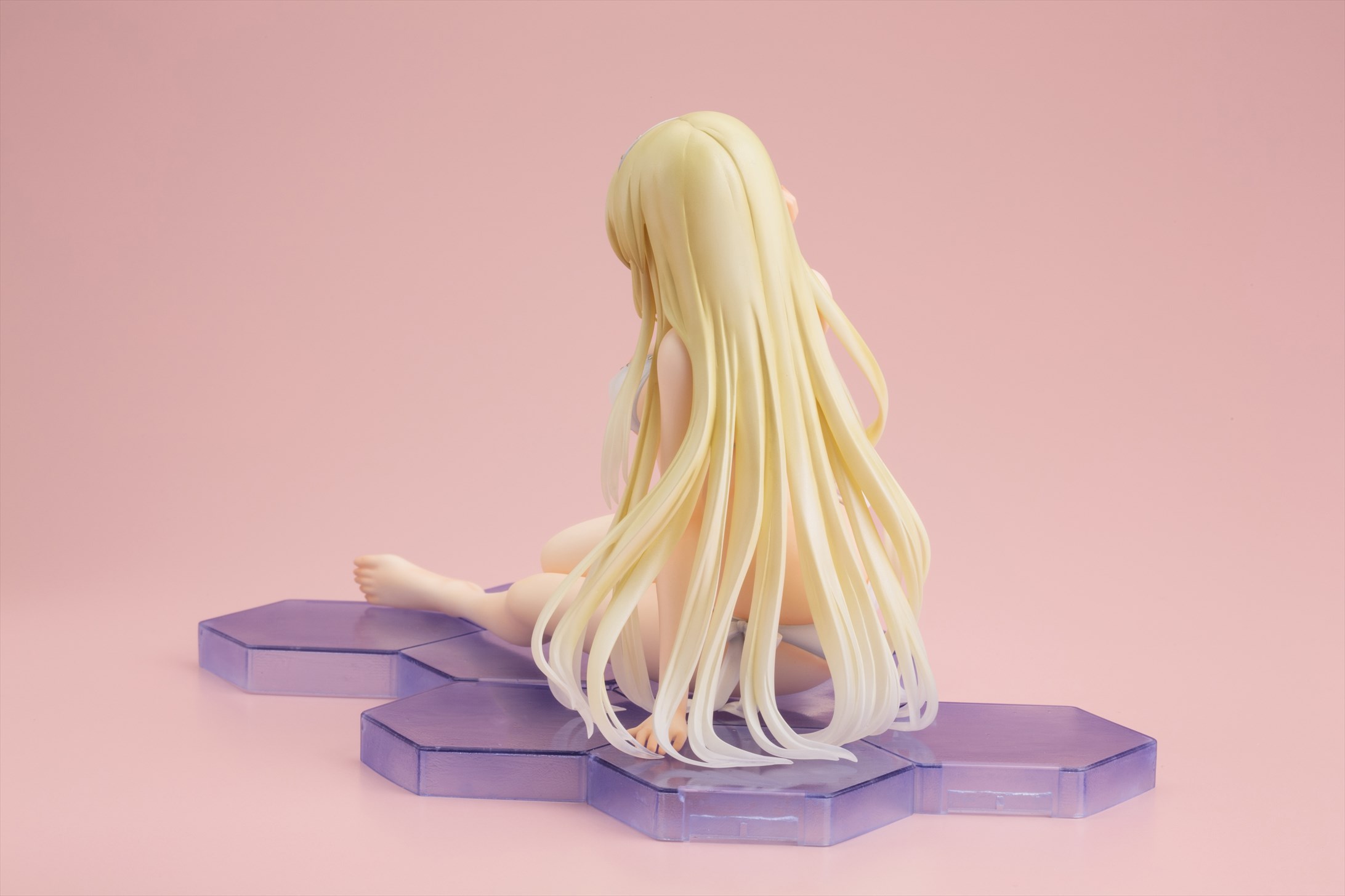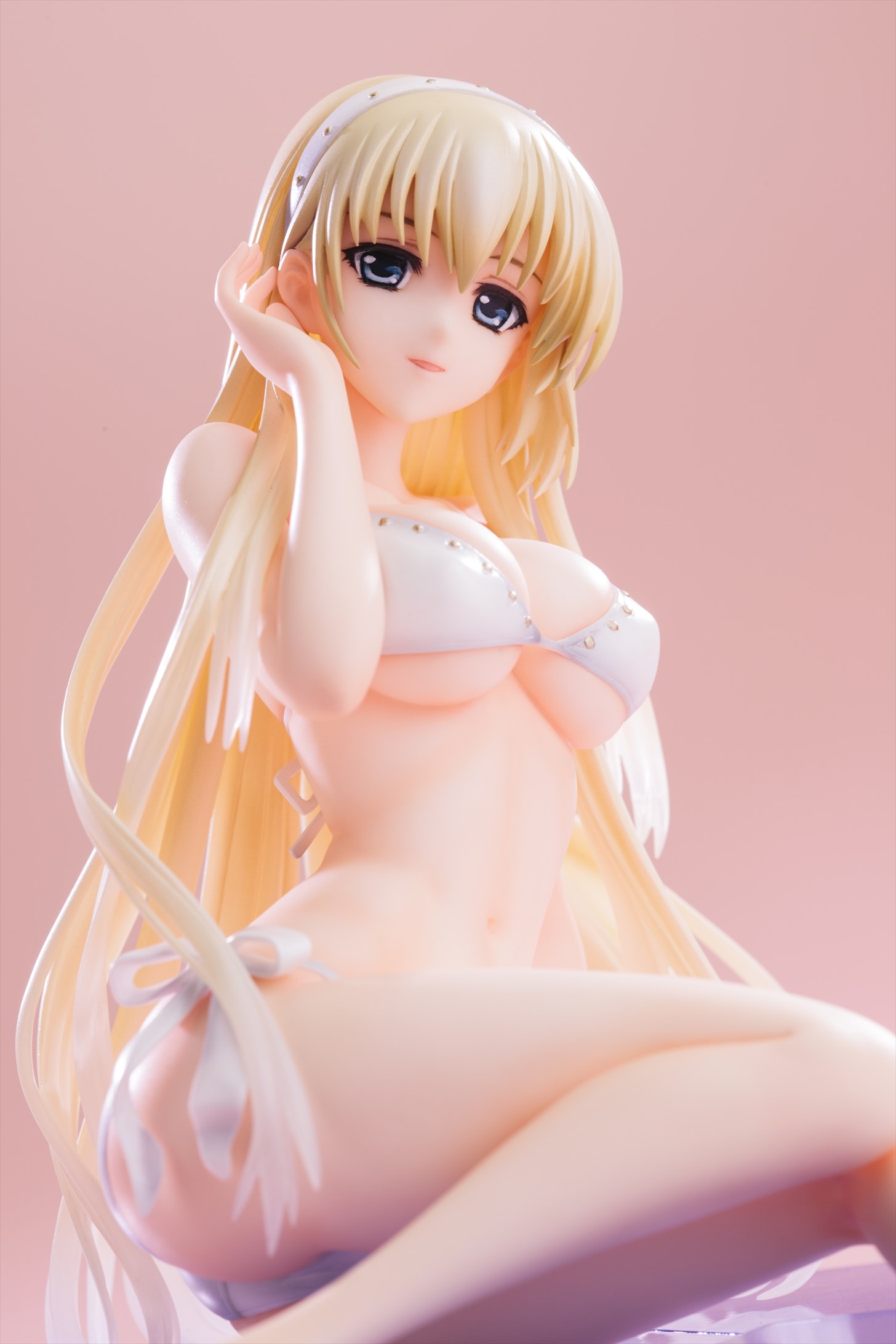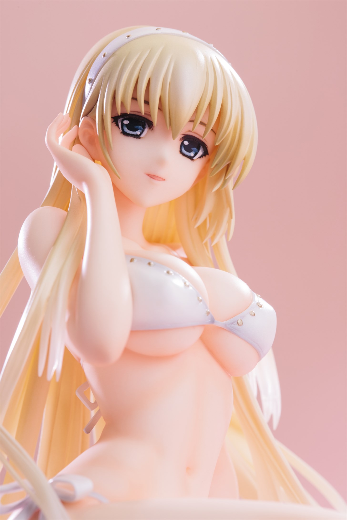 キャラクターデザインとイラストを担当するCARNELIAN氏が描く、繊細かつ美しいライン、華やかな顔立ちも丁寧に再現された逸品です。金の鋲があしらわれた純白のビキニは彼女の色白な柔肌を引き立て、毛先まで繊細な造形の揺れる金髪はパール塗装で華やかに仕上げました。隊長として辣腕を振るう碧眼の女傑が、一時の休息にて柔らかく微笑む表情が非常に魅力的です。