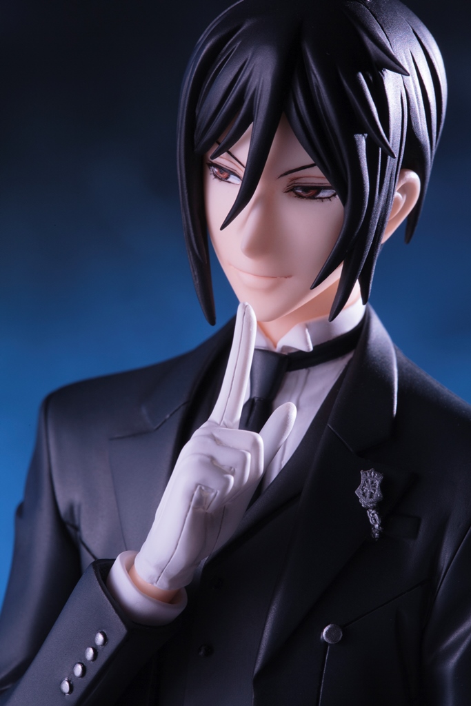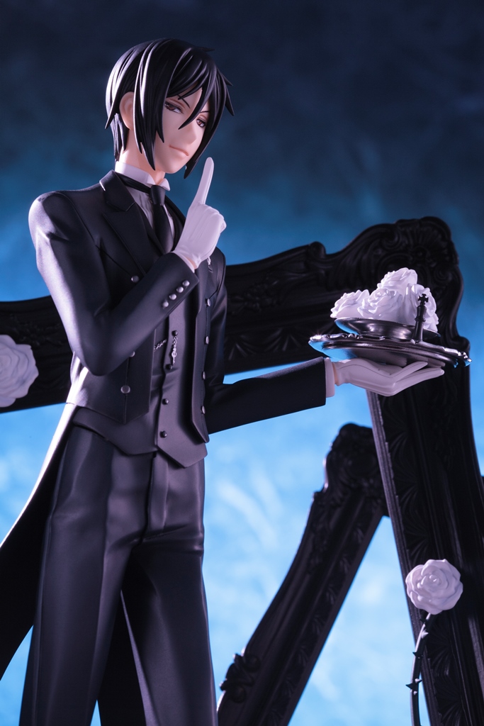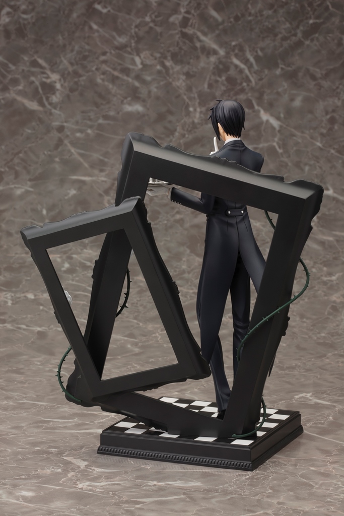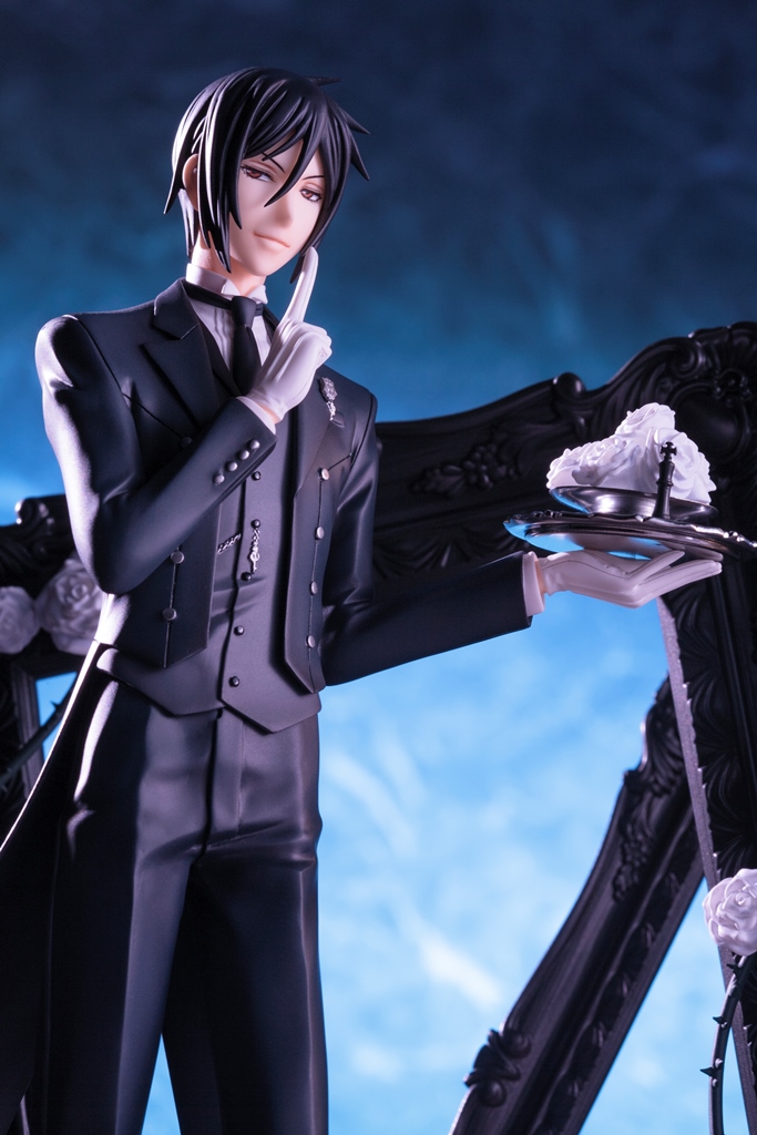 第1弾のシエル同様、チェスのイメージを盛り込み、圧倒的な世界観を持たせての立体化。燕尾服を身にまとい、蠱惑的な表情を浮かべるセバスチャンを精緻な造形によって表現しました。チェス盤を模したベースと背後に重なるシックな額縁がキャラクターの魅力を一層引き立てます。2015年3月発売予定の「シエル・ファントムハイヴ」と並べて飾ることで世界観をよりお楽しみ頂けます。