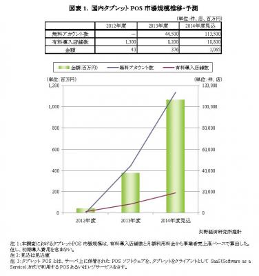 本調査におけるタブレットPOS市場規模は、有料導入店舗数と月額利用料金から算出した。初期導入費用は含まない。