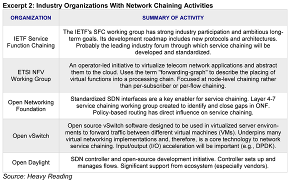 * How service chaining ties into software-centric network technologies such as NFV and SDN, enabling operators to create more dynamic, programmable network services