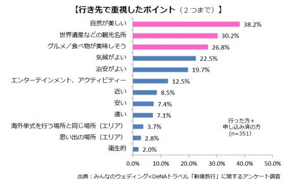 新婚旅行先を選ぶにあたり重視したポイントについて聞いたところ、トップは「自然が美しい(38.2%)」となり、次いで「世界遺産などの観光名所(30.2%)」「グルメ/食べ物が美味しそう(26.8%)」と続きました。