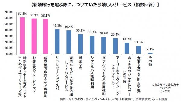 さらに、「新婚旅行のプランに付いていたら嬉しいサービス」についての質問では、有名レストランやディナークルーズなどの「特別ディナー(61.5%)」がトップにあがりました。ハレの機会、新婚旅行での特別感を求める傾向が伺えます。