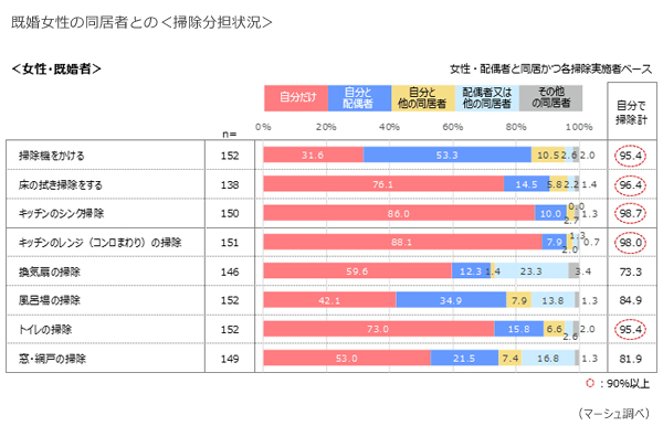 その中で、既婚女性の同居者との掃除分担の状況を尋ねると、床の拭き掃除やキッチン周りは「自分だけ」が9割以上を占める。一方で、掃除機をかける、風呂場の掃除は配偶者と分担している傾向がみられた。