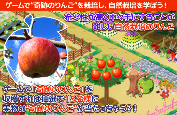 本イベントでは、木村秋則氏が実践した自然栽培をゲーム上に再現。ゲームで育てて収穫すると、“奇跡のりんご”2個セットを抽選で15名様にお届けいたします。