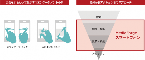 MediaForgeでは、スマートフォン画面上の広告を「さわって動かす」ユーザーのアクションを“エンゲージメント”と呼び、ユーザーが広告を“認知した”指標として定義しています。“エンゲージメント”を指標として広告配信対象を最適化することで、従来のクリック指標だけではリーチしていなかったユーザーを取り込み、新規顧客獲得を目指します。2014年11月時点では国内最大級となる、のべ3000億imp(アドインプレッション※注)以上の月間広告在庫に対して広告配信が可能です。
