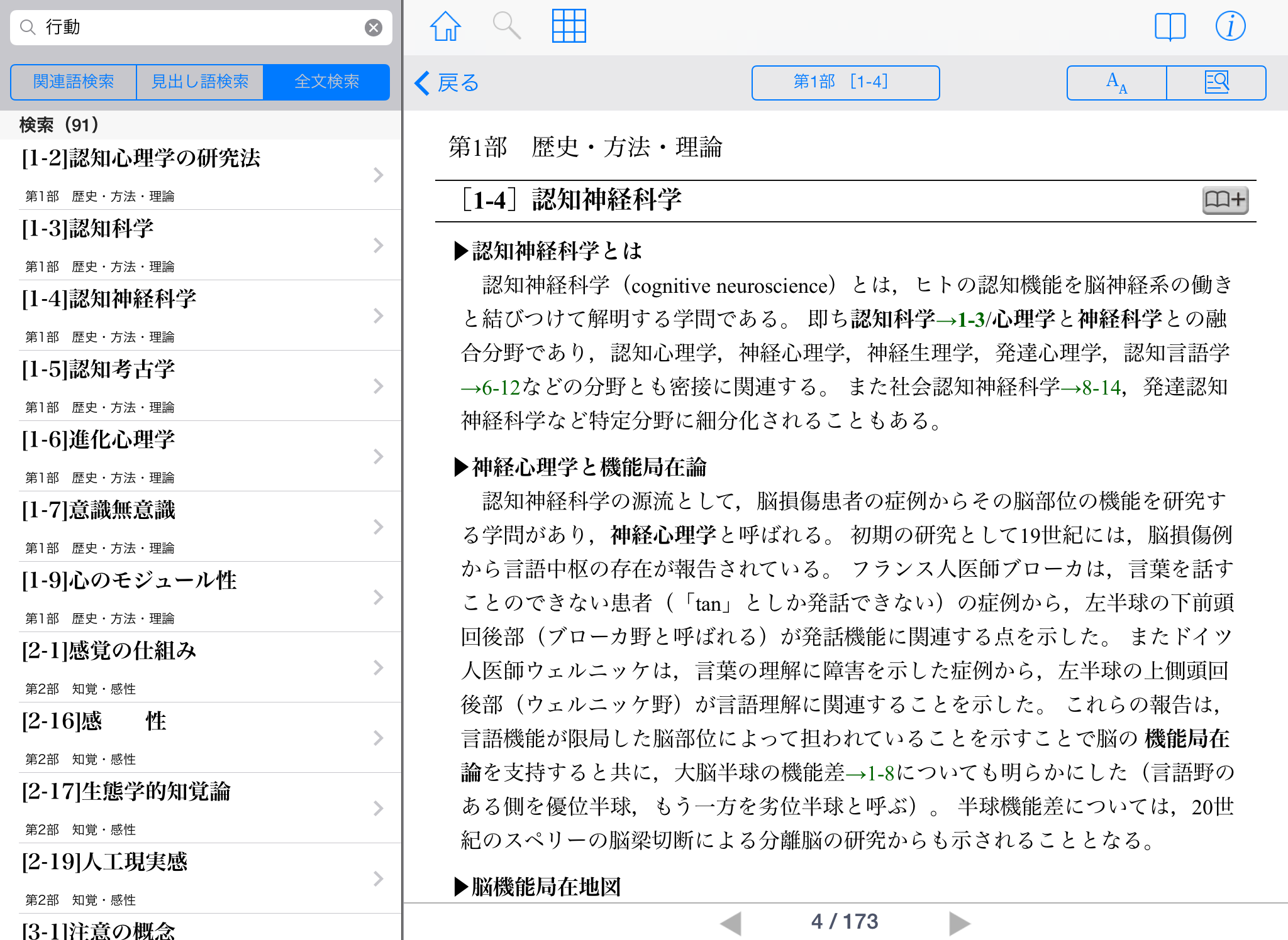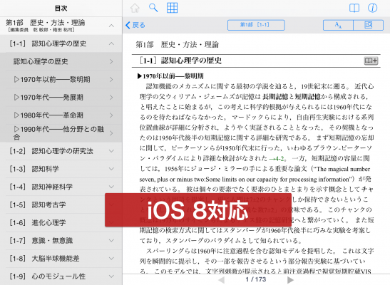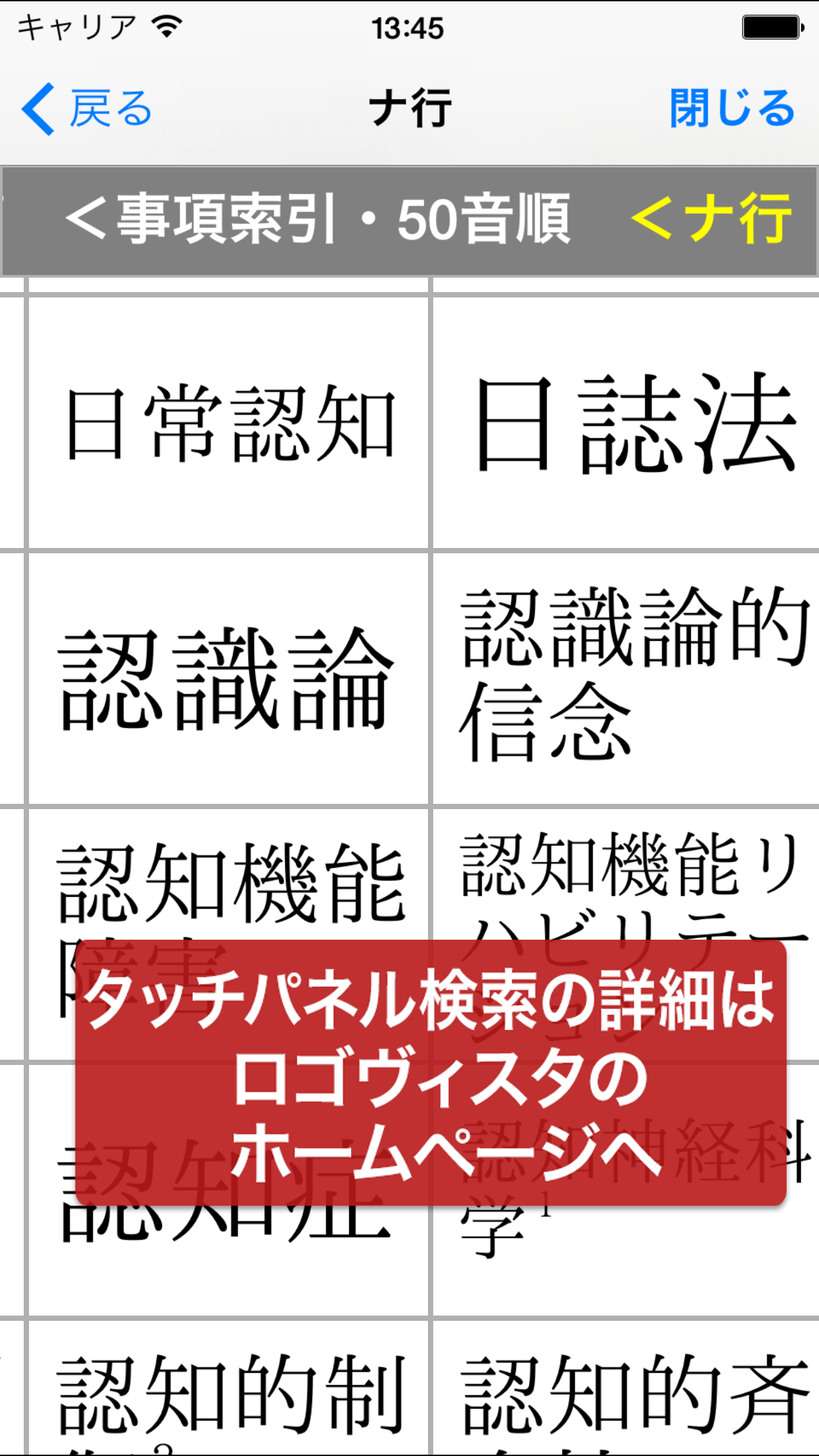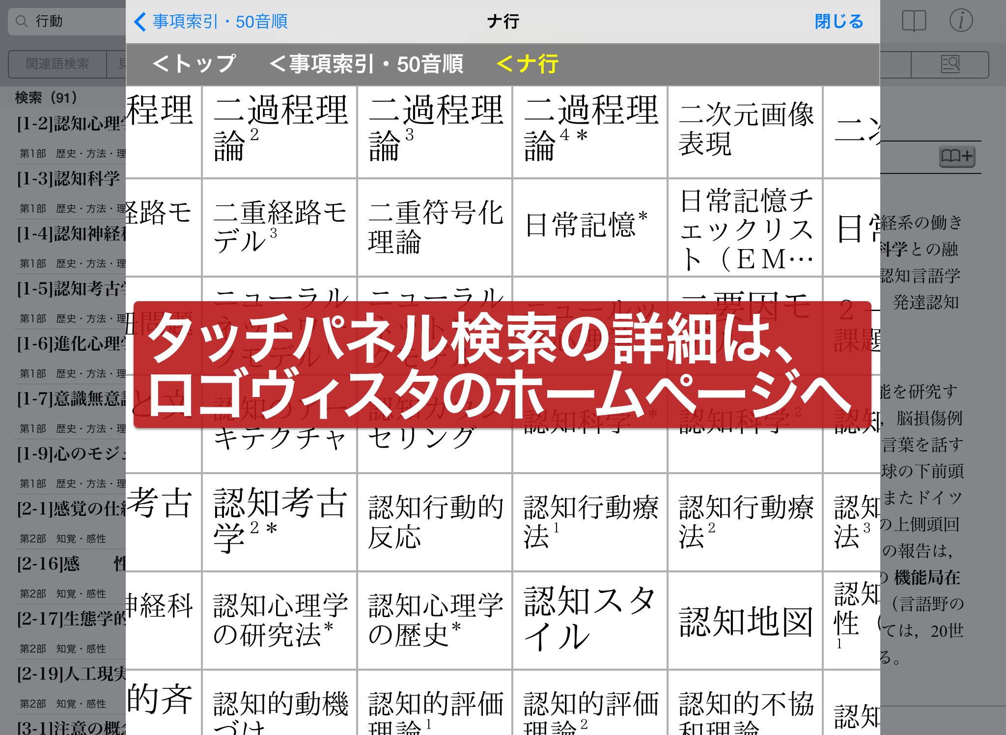 ●検索オプションを用意(関連語検索/目次検索/全文検索)。それぞれの検索方法で、文字を入力すると候補見出し語が表示されるインクリメンタルサーチに対応(関連語検索のみ)