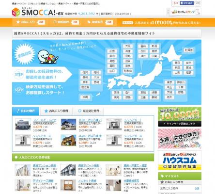 『賃貸SMOCCA!-ex(スモッカ!)』は、北海道から沖縄までの物件情報が毎日更新される物件名公開多数の日本最大級の賃貸検索サイトです。サイトを利用いただきご契約いただいた方には成約お祝い金として1万円をもれなくプレゼントするキャンペーンを実施しております。