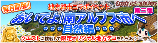 株式会社エルディ(本社:東京都目黒区、代表取締役:宮崎 尚登)と、株式会社サクセス(本社:東京都品川区、代表取締役:吉成 隆杜)は、山梨県南アルプス市観光協会(中込博文市長)と提携し、2014年11月12日(水)よりアプリゲーム『畑っぴ~里山くらし~』にて、期間限定キャンペーン「毎月開催! 地方都市コラボイベント おいでよ!南アルプス市へ 第三弾」を開始いたします。