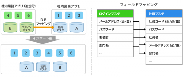 DBマッピングとフィールドマッピングにより、異なるDB構造でも「アプリ」を連結可能になります。