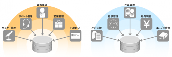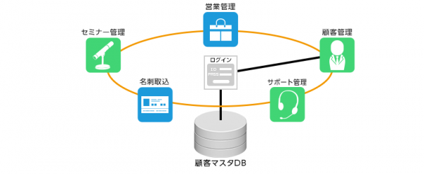 DBに「アプリ」を連結した先にある、「アプリ」同士もつなげたいニーズに応えます。顧客データや社員データを中心としたアプリケーションにつきもののログインを、「アプリ」同士の認証を繋げることで、1回のログインで自由に行き来できるようにます。