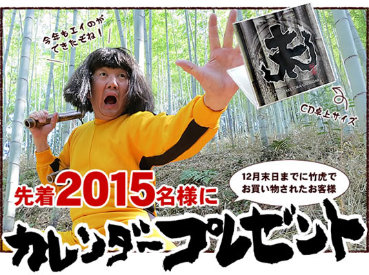気温がグッと下がり、年末の慌ただしさが感じられるようになりました。今年も残すところあとわずかです。竹虎では毎年恒例のカレンダープレゼントが始まりました。2014年11月17日(月)~12月31日(水)の期間中、虎斑竹専門店 竹虎のウェブサイトで商品をお買い上げいただいた方、先着2015名様に竹虎特製卓上カレンダーをプレゼントいたします。