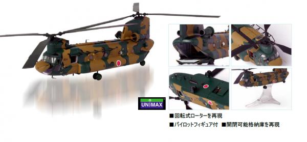「チヌーク」は、ボーイング社が開発したタンデムローター式輸送ヘリコプターです。半世紀以上の運用実績があり、日本の陸上自衛隊でも運用中です。最大55名を輸送可能な大型格納庫を装備しており、災害派遣でも活躍する自衛隊最大の大型ヘリコプターでありながら、水平時の最大速度は300km/h以上と高速を誇ります。モデルでは回転式ローターや開閉式格納庫を再現、カラーリングは群馬県の相馬原駐屯基地の第12旅団配備、CH-47J型を参考に制作しました。専用台座も付属、ディスプレーに適しております。