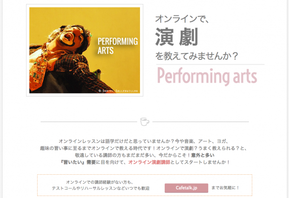 その流れを汲み、語学以外のレッスン、カテゴリを充実させるため、この度「オンライン演劇講師」募集ページをリリース致しました。