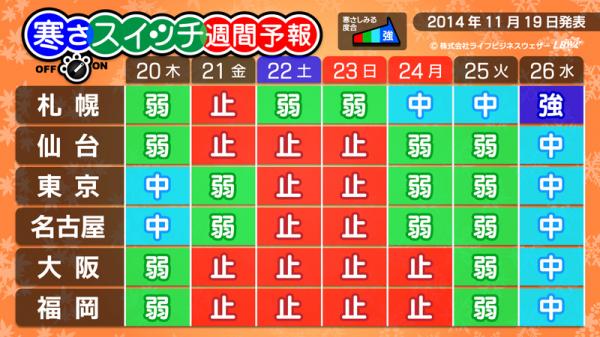 生活密着型天気予報を配信する株式会社ライフビジネスウェザー(本社:東京都中央区、代表取締役:石川勝敏 以下、LBW)は、2014年11月19日、特設サイトにて寒さの到来をいち早く伝える「寒さスイッチ予報」及び、寒さと関係のあるおでんのおいしい度合を伝える「おでん前線」予報の第10回発表を行いました。