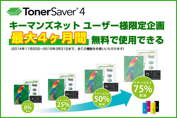 キーマンズネットのTonerSaverサイトをご覧いただいたユーザー様限定で、製品版と同一機能のソフトウェアを2015年3月末まで、最大4ヶ月、無料でお使いいただけます。