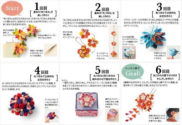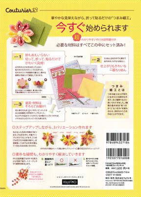 このたび新発売したレッスンキットブックは、手づくり雑貨通信販カタログ『Couturier[クチュリエ]2014-’15年秋冬号』60ページ掲載の人気キット、【きれいに作れるコツが学べる つまみ細工 「はじめてさんのきほんのき」の会(6回限定コレクション)】の1回分のキットを、キットブックとして発売したものです。あらかじめ材料や道具がすべてセットされているので、すぐに始めることができます。セットされている「作り方説明書」は、作り方のポイントが写真やイラスト入りでわかりやすく解説されており、接着剤をつける分量やちりめん布をカットするときの注意などきれいに仕上げるためのヒントが満載で、手芸初心者の方でも満足いく作品を完成させることができます。