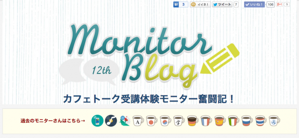 精鋭12名のモニターによる個性豊かなモニターブログは、カフェトークでの新たな講師やレッスンとの出会いに、お役立て頂けること間違いなしです。