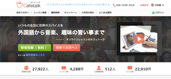 英会話はじめ韓国語・フランス語・スペイン語・日本語などの語学から、音楽・芸術・ヨガ・趣味系のレッスンまで、ユニークなレッスンを提供し続けるオンラインレッスンサイトのカフェトーク。
