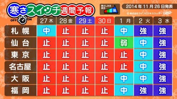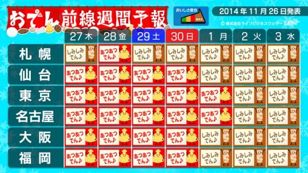 生活密着型天気予報を配信する株式会社ライフビジネスウェザー(本社:東京都中央区、代表取締役:石川勝敏以下、LBW)は、2014年11月26日、特設サイトにて寒さの到来をいち早く伝える「寒さスイッチ予報」及び、寒さと関係のあるおでんのおいしい度合を伝える「おでん前線」予報の第11回発表を行いました。