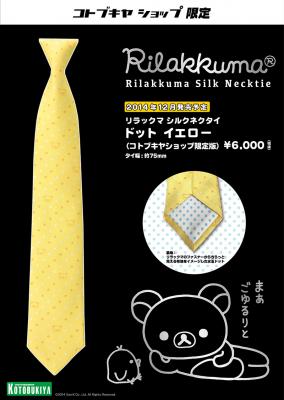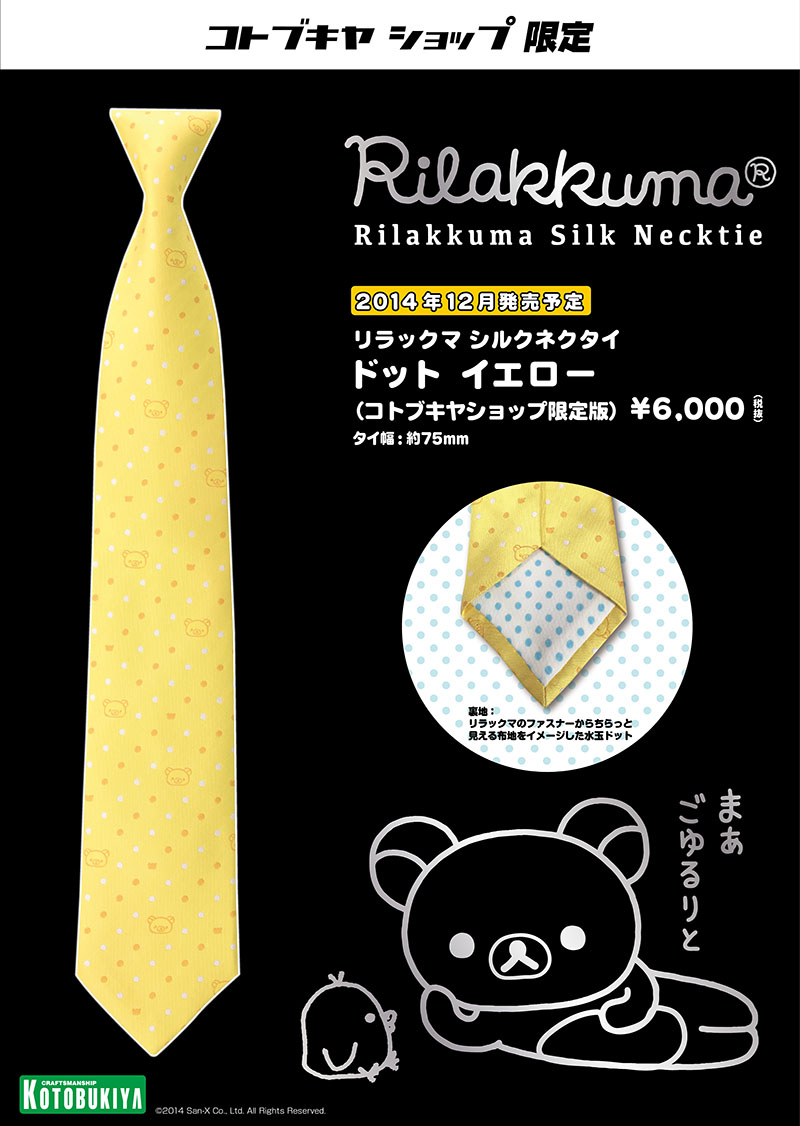 ホビーメーカー株式会社壽屋(本社:東京都立川市曙町/代表:清水一行)は、2003年にデビューしてから世界中の人々を惹き付けてやまない人気キャラクター・リラックマとの夢のコラボレーションとして、「リラックマ シルクネクタイ」のコトブキヤショップ限定カラーを2014年12月に発売します。