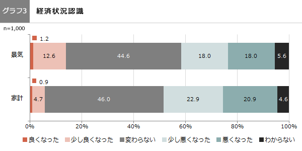 日本の景気と暮し向きについて、1年前と比べて5段階評価で問うと、景気は好転13.8%(良くなった1.2%、少し良くなった12.6%)、変わらない44.6%、悪化36.0%(少し悪くなった18.0%、悪くなった18.0%)になり、第2次安倍内閣の金融政策、財政政策、成長戦略が成果を出していないと既婚成人女性は感じていることが伺えます。