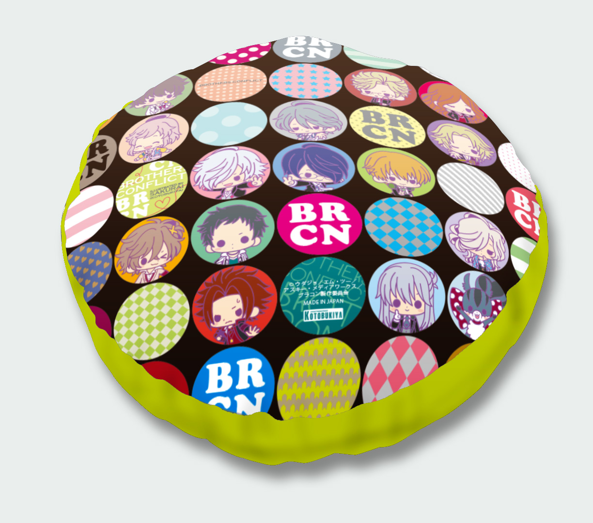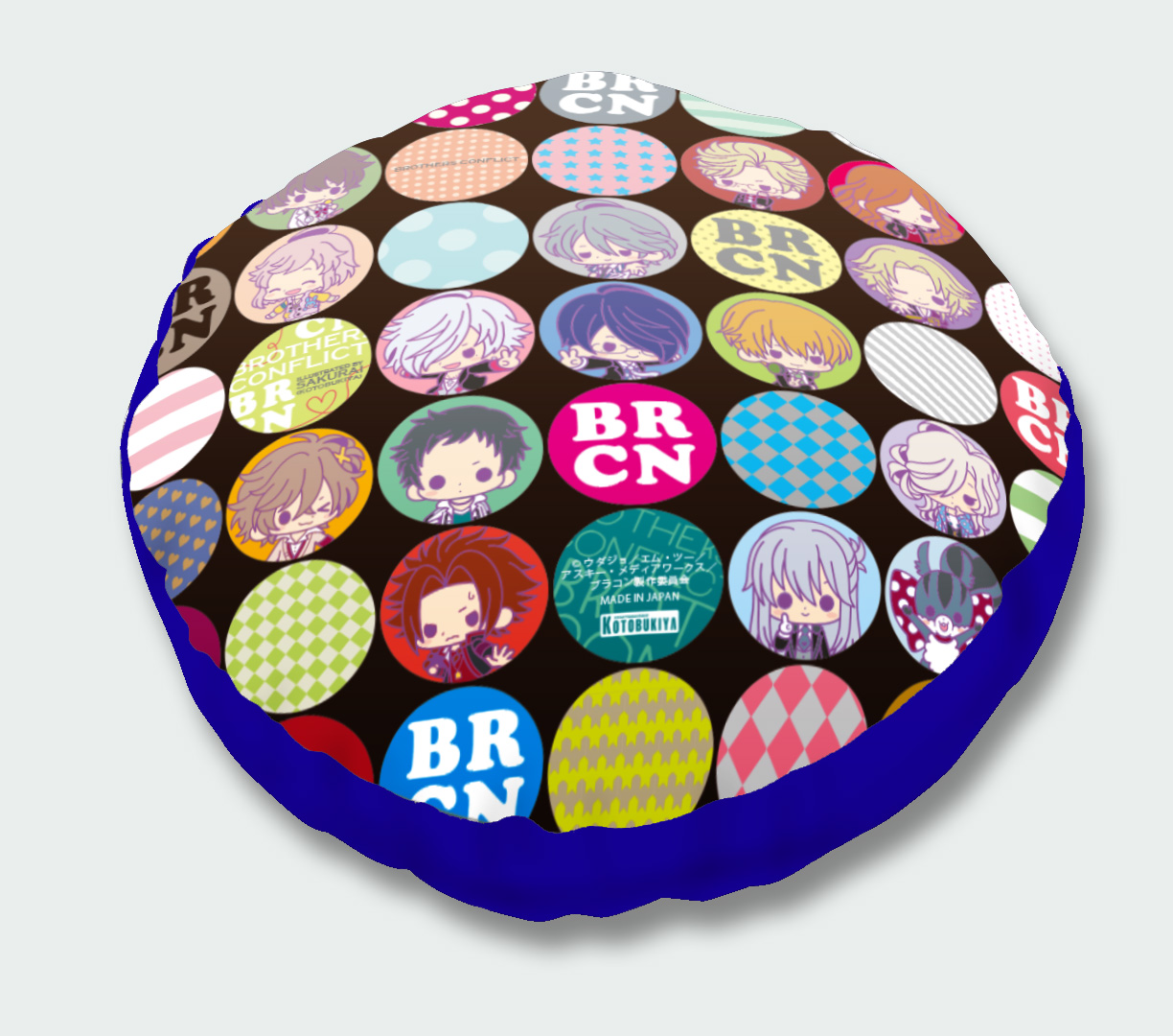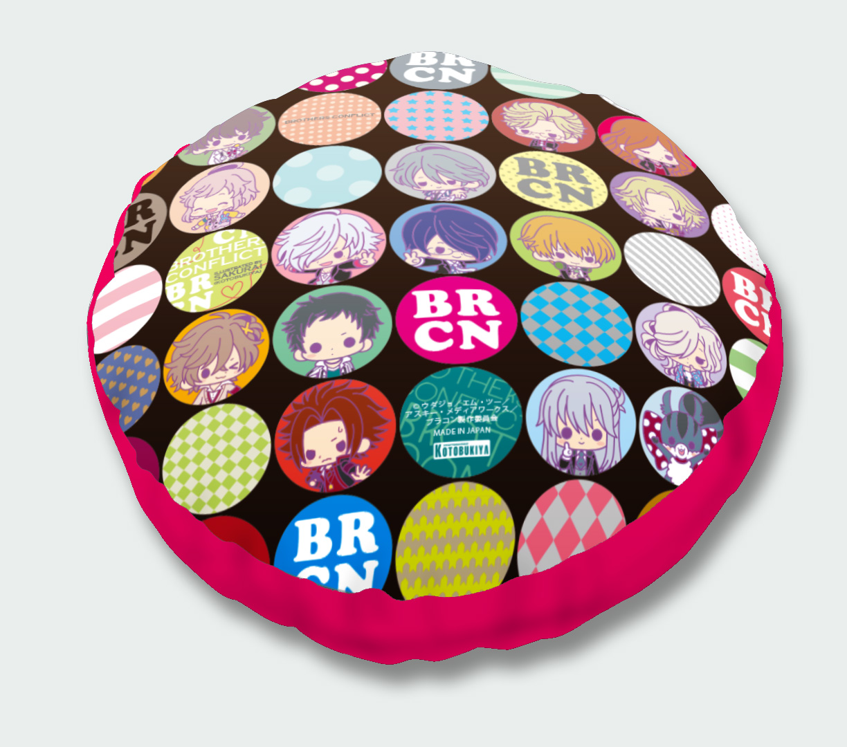イベントで先行販売した「My Dear☆クッション」を、コトブキヤ直営店舗限定でも販売します。種類は朝日奈 椿/朝日奈 梓/朝日奈 棗/ジュリの全4種。イラストはすべて人気イラストレーター・サクライ氏による描き下ろしを使用しました。表面にはキャラクターのイラストを大きくプリントし、裏面には『BROTHERS CONFLICT』のキャラクター達がちりばめられたポップな総柄をプリント。直径約28cmとミニサイズのクッションなので、ギュッと抱きしめやすくコレクションしやすいアイテムです。オフィスやお部屋、是非色々なシーンでお気に入りのキャラクターと一緒にお過ごし下さい。