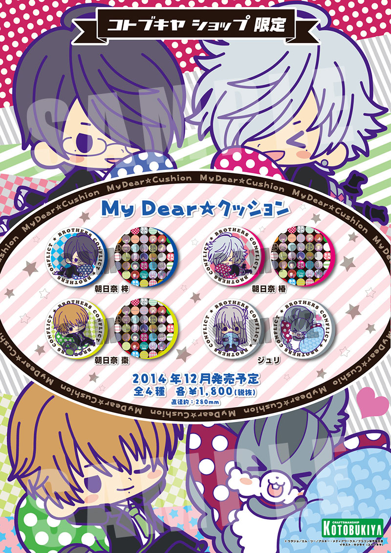 ホビーメーカー株式会社壽屋(本社:東京都立川市曙町/代表:清水一行)は、ゲーム・小説・TVアニメとマルチに展開する人気作『BROTHERS CONFLICT』のキャラクター4人をデフォルメしたイラストを使った「My Dear☆クッション」を、コトブキヤショップ(秋葉原、日本橋、オンラインショップ)限定で2014年12月に発売します。