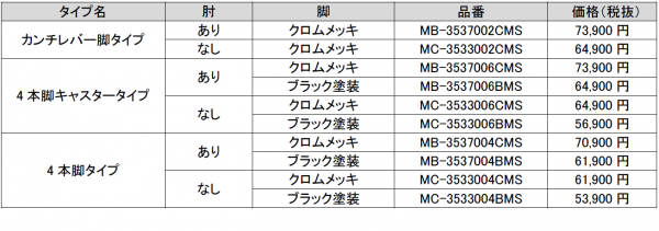 タイプは「カンチレバー脚タイプ」、「4本脚タイプ」、PLUSオリジナルの「4本脚キャスタータイプ」の3種類。それぞれクロムメッキ脚とブラック塗装脚をご用意(「カンチレバー脚」はクロムメッキ脚のみ)。背カラーはブラック、ライトブルー、イエローグリーン、オレンジ、ライトグレー、バイオレットの6色。価格(税抜)は53,900円~73,900円です。