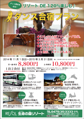 ゴルフ場やホテル、旅館、大型複合リゾートなどを運営&運営受託し、リゾートの再生・活性化を推進するリゾートソリューション株式会社(略称・リソル、東京都新宿区、多賀道正社長)が、都内から約1時間とアクセスに恵まれた首都圏で運営する大規模リゾートコミュニティ「生命の森リゾート」(千葉県長柄町)。同リゾートでは現在、ダンス愛好家グループの皆様のための『リゾートで120%楽しむ♪~ダンス合宿プラン』(下記参照)を2015年3月31日まで好評受付中です。