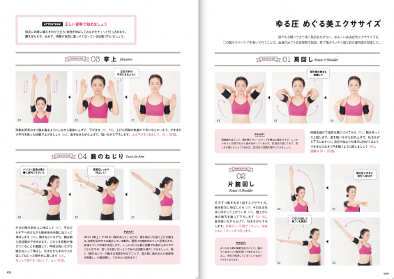 付録のゆる圧 二の腕サウナバンドを巻いた、加藤式ビューティープログラムを大公開。これらは実際に、加藤の元に通う女優、モデル、アーティストも行っているエクササイズ。リンパと体液を流した後に、誰でも簡単にできる“非炎症性エクササイズ”である「ゆる圧 めぐる美エクササイズ」を行うだけの手軽さ!