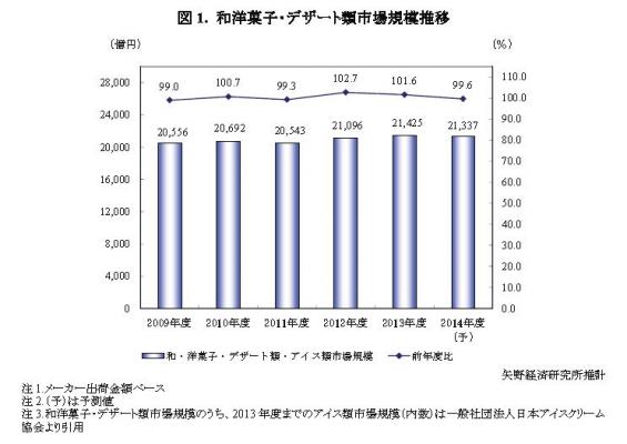 ◆ 2014年度の和洋菓子・デザート類市場は前年度比0.4%減の2兆1,337億円を予測
