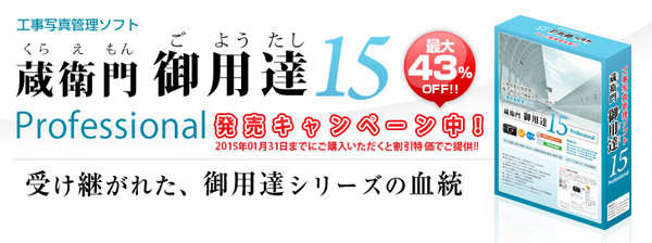 株式会社サンロフト(静岡県焼津市、代表取締役社長:松田敏孝)は、工事写真管理の定番ソフト「蔵衛門御用達 15 Professional」を、2014年12月5日から2015年1月31日まで「発売キャンペーン」期間とし、以下のとおり最大43%OFFの特別割引価格にて販売を開始しました。