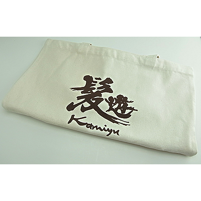 久留米市の理髪店が、2014年8月に迎えたという開店15周年記念の粗品として制作されたエコバッグ。シンプルな素材バッグに名入れしたのは当店ロゴマーク、躍動的な雰囲気がとてもよく伝わります。常連のお客様やお世話になった方々に配られたとの事です。