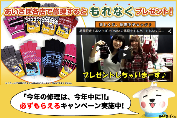 「期間限定!あいさぽでiPhoneの修理をすると、もれなくスマホ用あったか手袋プレゼント!」キャンペーンを実施致します。