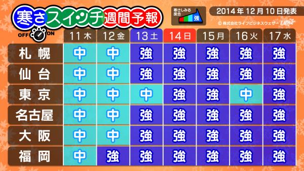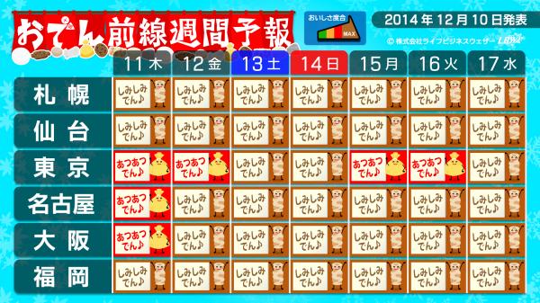 生活密着型天気予報を配信する株式会社ライフビジネスウェザー(本社:東京都中央区、代表取締役:石川勝敏以下、LBW)は、2014年12月10日、特設サイトにて寒さの到来をいち早く伝える「寒さスイッチ予報」及び、寒さと関係のあるおでんのおいしい度合を伝える「おでん前線」予報の第13回発表を行いました。